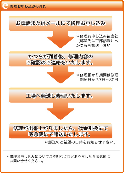 □郵送先 〒110-0016 東京都台東区台東4-20-11 谷古宇ビル5F エコウィッグ 担当 安尾 *お支払い方法は「代金引換」となります。 (代引き手数料および送料は弊社負担いたします。) *修理お申し込みについてご不明な点などありましたらお気軽にお問い合せください。