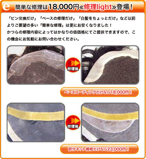 修理価格: 18,000円(税別) 修理内容: ピン交換(5個まで) 修理内容: ベースコーティング 修理価格: 23,000円(税別) 修理内容: 白髪増毛(3%以下) 修理内容: 部分ネット補修(4平方メートル以内) 修理内容: 接着面(台)交換 修理価格: 28,000円(税別) 修理内容: 白髪増毛(7%まで)
